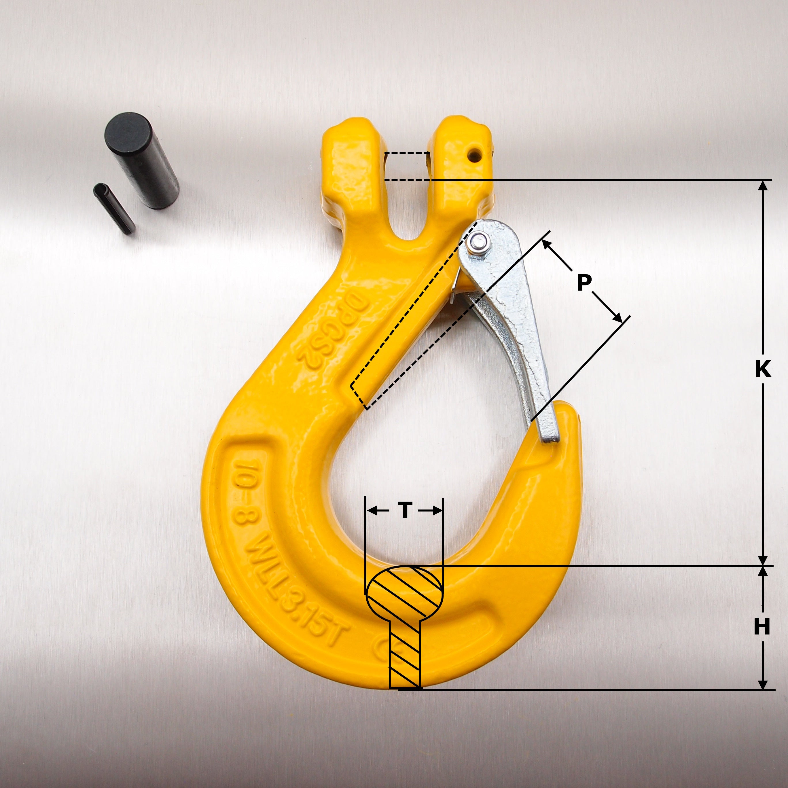Weight (kg) H (mm) K (mm) P (mm) T (mm) To fit chain size (mm) WLL (Tonnes)